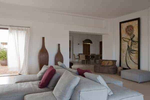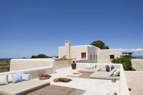 “The last Mediterranean paradise” is an expression used often to describe Formentera Island in the Balearics and it is what pushed the Italian owner of this beautiful, luxury villa, to focus her search for her new holiday bolthole, in this pristine island with famous beaches. It was love at first sight when she visited the plot; it had it all. Uninterrupted views, large spaces, mature vegetation and the fact that, being in the centre of the island, it is ideally located to reach out to the best that Formentera has to offer. Due to the persistence of her visiting friends, what she envisioned as a cosy and small villa soon turned to be a larger project, as she realised that Formentera is all about being social and that true luxury villas with a convivial atmosphere, were scarce. Two years later, a true gem materialized; an unpretentious yet stylish villa, whose traditional cubic volumes reflect the bright light of Formentera. The owner was responsible for furnishing this villa with an aura of coolness, enhanced by the simplicity of pure linen fabrics and luxurious understated details, craved by the cosmopolitan bohos and bobos alike. Inside you find modern, practical, polished concrete flooring, wood, corten and whitewashed walls; natural materials and finishes that enhance the feeling of freshness and fulfil the owners’ wish to maintain the characteristic flavour of Formentera. The intentional sensation of bareness and calm is combined with personal touches and with state-of-the-art technology to ensure that everyone can find its own haven.