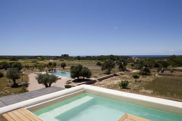 Completed in 2012, this property can accommodate up to 12 people in 6 en suite bedrooms; an additional independent single bedroom is devoted to staff accommodation. The villa is divided in two different buildings, the annex being ideal for guests who want to enjoy extra privacy or for visiting friends. Contrary to most rooftop terraces, abundant in Ibiza and Formentera, the rooftop solarium is designed as a real chill out, “an outdoor living room with magnificent views and the added benefit of a heated outdoor Jacuzzi”, as we like to think of it. Despite being geared towards social gatherings (the communal areas afford plenty of space), the size of the plot and its settings ensure that peace and refuge is granted to those who favour withdrawing from the bustle of everyday city living. The furniture is an interesting blend of a simple but sophisticated style and understated designer pieces. You will certainly find irresistible its outdoor spaces, where Mediterranean trees and aromatic bushes have been retained or planted anew: rosemary, sage, pomegranate, orange and olive trees, among others. A natural backdrop for the large, exquisite and welcoming swimming pool, built on concrete and surrounded by a wooden sundeck.