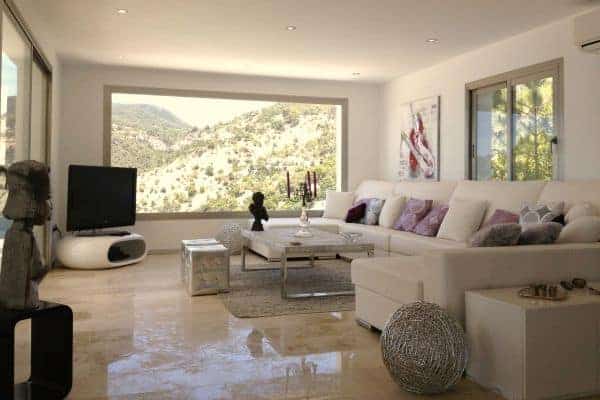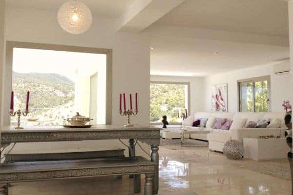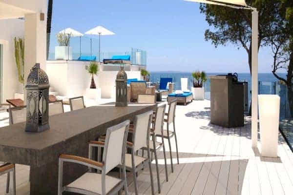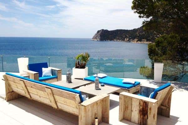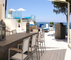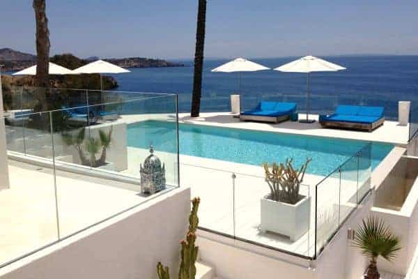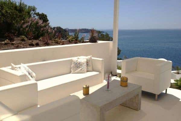 A new and luxurious villa in Ibiza impressively spans 400 sq. m of indoor living space and an equable amount of charming terraces within 1200 sq. m of private grounds. Over a big bay high above the sea and natural wild creeks, the remarkable setting of this luxury villa offers a spectacular view. The villa faces south to acknowledge an endless sea and Formentera in the distance. Located a few minutes from the village of Es Cubells and a ten-minute drive from San Jose (25 minutes to Ibiza Town) this is chic modern designer villa, with Moorish touches and influence prominent. The property gleams a pure white and has a combination of clean lines and straight edges and spectacular terraced levels for heightened views. Recently refurbished (2012) with clean lines and edges gleaming pure white, the inside the décor is appropriately bright. Modern and understated furniture and fitting incorporate the finest materials, including African marble, leather and luxury textiles. The floors glisten and the bright and breezy living areas include an open plan double indoor lounge and dining room, which overlooks the sea and eventually opens out on to a terrace. Indeed, the expanse of terraces is quite awesome and cleverly arranged. All have a glazed balustrade and there are a variety of furnished areas for rest and relaxation al fresco. Guests can soak up the Balearic sun from the massively spacious outdoor lounge, as well as a bar and a dining area, and thrill to the view from the infinity pool that dangles above the deep blue Mediterranean Sea.