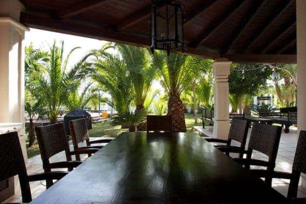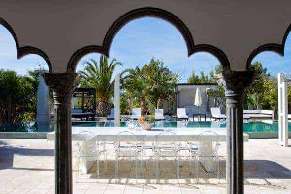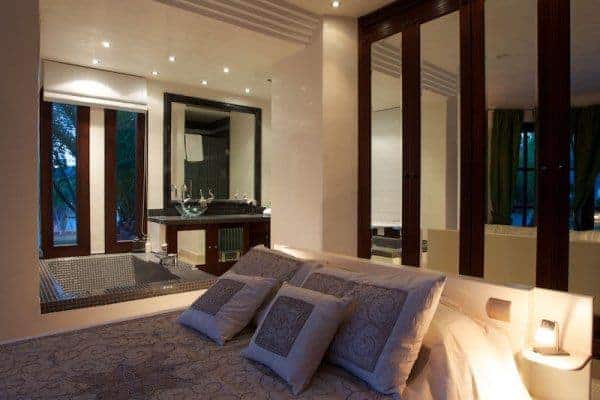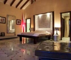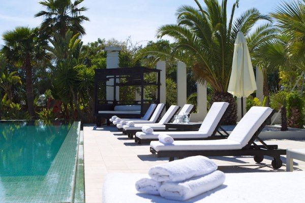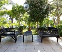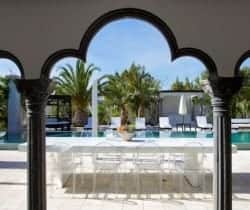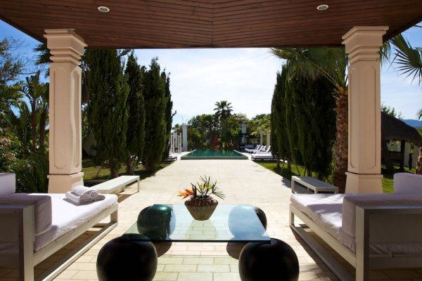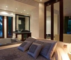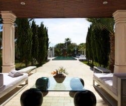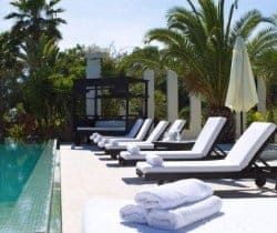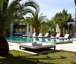 This luxury villa can accommodate 8 guests in 4 sizeable double bedrooms en suite – 2 master and 2 smaller – and the main building also houses an indoor dining room and a chill-out area on the first floor. Otherwise, much of life here is lived outside and we are very impressed by the well-considered outdoor facilities and the palm tree lined landscape garden with an Oriental mystique. Among its treasures are an al fresco dining and barbecue areas, chill-out patios, a rather lovely swimming pool bedecked with white sunbeds along one side, a DJ booth and al fresco bar, solarium and Jacuzzi. For the more active of indulgence seekers, there is a gym with free weights, a tennis court and villa staff will organise retreat-style services; yoga, reiki, pilates, to name just a few.