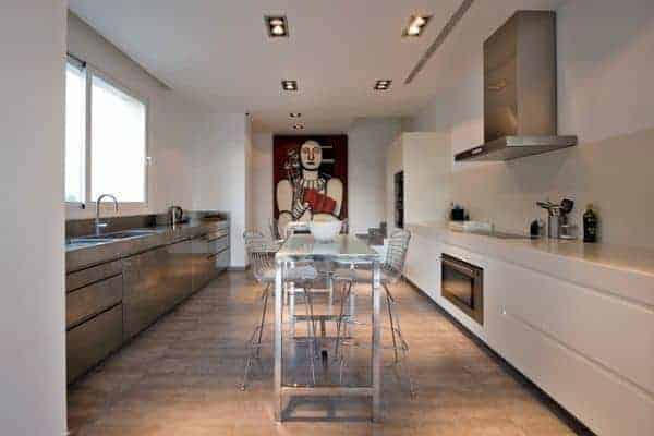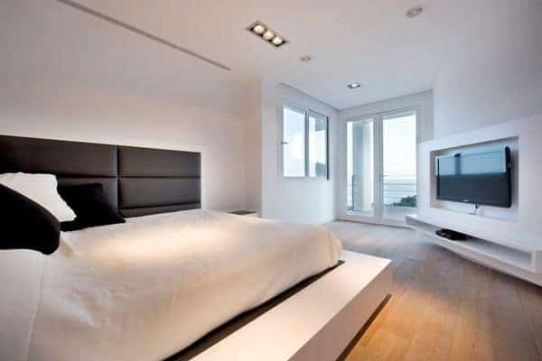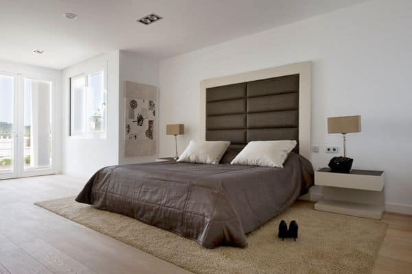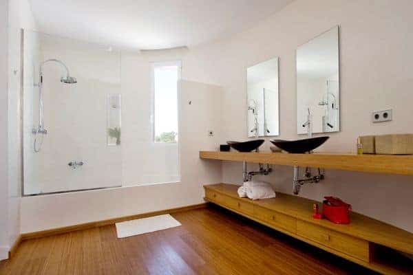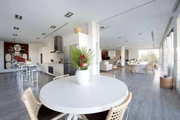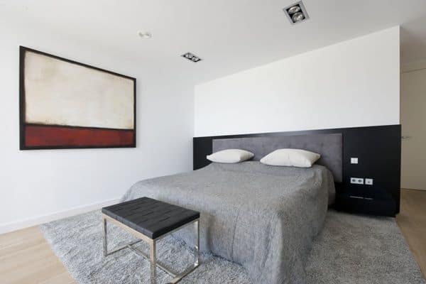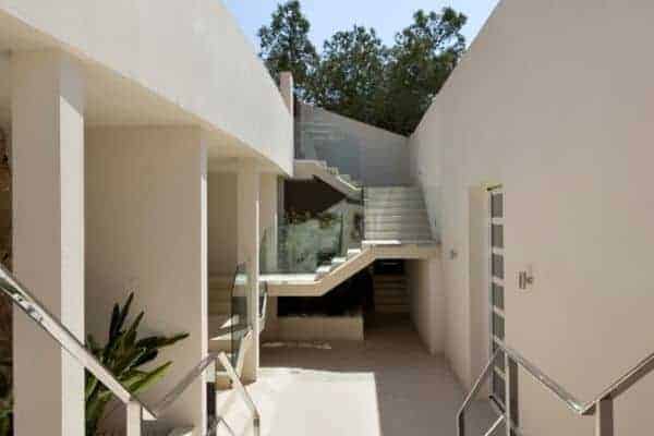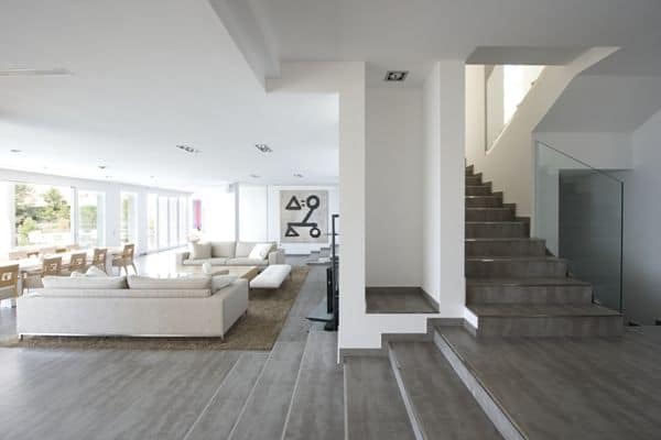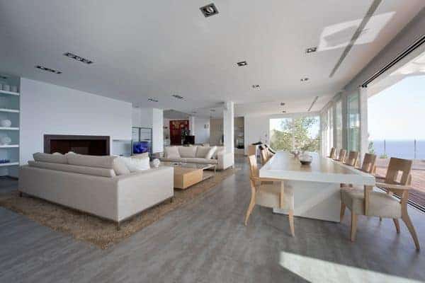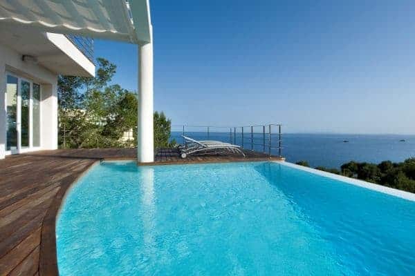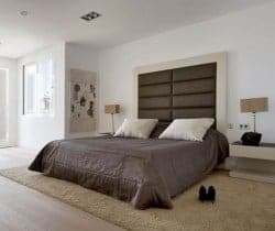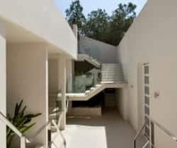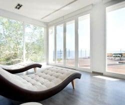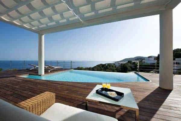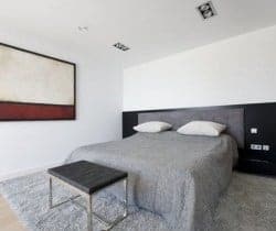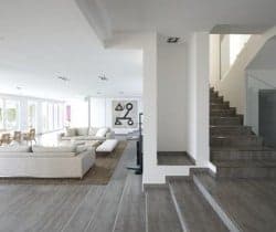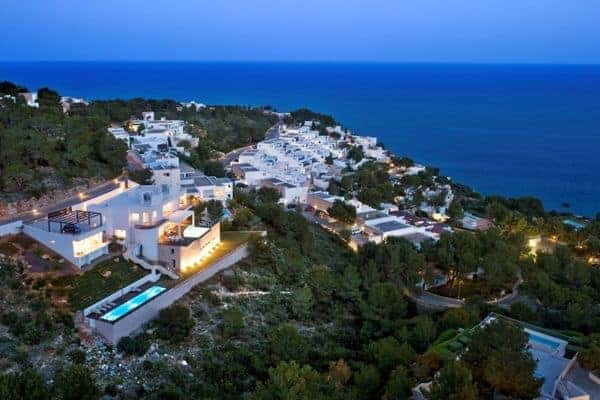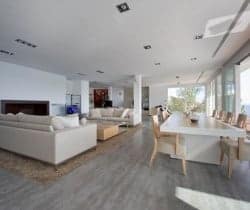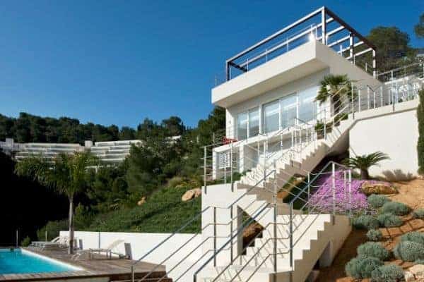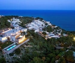 Roca Llisa – a gated compound with 24-hour security – is an exclusive and peaceful enclave situated in a gorgeous location on Ibiza, close to the 2 golf clubs on Ibiza. Located here is a stunning contemporary luxury villa. The property offers wonderful sea views, as far as Formentera, and is midway between Ibiza Town (10 minutes by car) and the town of Santa Eulalia del Rio. This chic designer property consisting of a main villa with guesthouse annex is the creation of a famous architect, Carlos Rojas Madrid. The interior design is by another well-known Spanish designer, Paco Teran who also crafted the furniture, rugs and lighting. Large bay windows allow lots of light inside to enhance the contemporary minimalism of the interior’s straight lines and white walls, dotted with unusual contemporary and ethnic art. This is in lovely contrast to the primarily beige palette of furnishings and floors. Water is also a key element of the design and the villa boasts 3 pools; two outside, on the terrace and in the garden below, and an indoor pool next to a hammam and Jacuzzi. The views are amazing and the villa’s is design is ideal for quality relaxation and entertaining, both indoors and out.