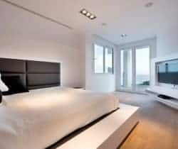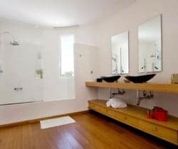 The property has 5 luxurious and spacious en suite bedrooms, which accommodate up to 10 people. The generous living area lined with floor to ceiling windows overlooking the pool has a fireplace for the winter months, and a dining area which seats 10 comfortably at the main table. Unusual sliding glass doors lead to the large and a fully loaded kitchen, complete with breakfast bar and table. The fully appealing, private and scenic outdoor amenities will be much appreciated and much used by all. If you wish for some private repose and solitude, you can withdraw inside to the tranquil reading corner/library or cosy TV room next door. The guesthouse is autonomous with comfortable modern suite – lounge, bedroom en suite, kitchen with bar and private terrace – and there is also separate staff quarters on the ground floor of the villa.