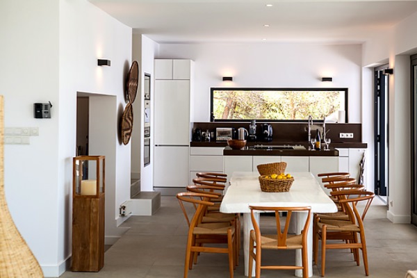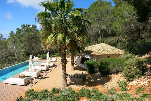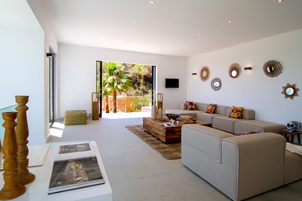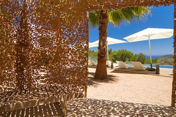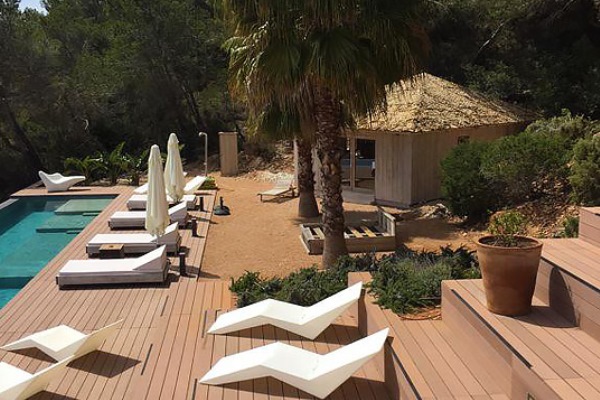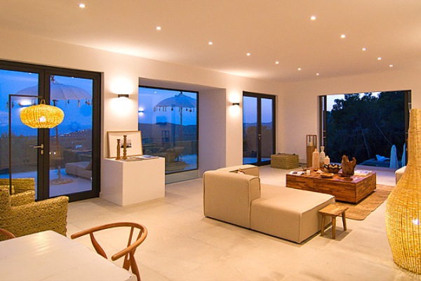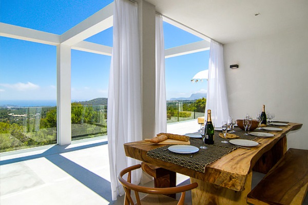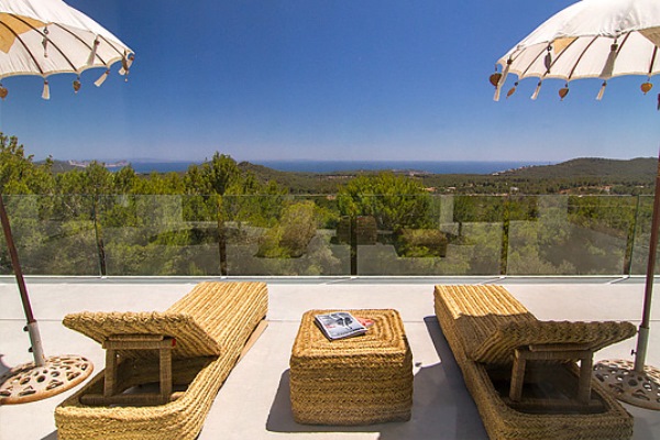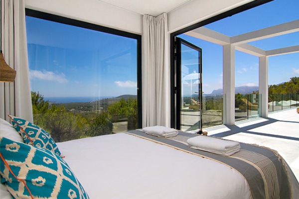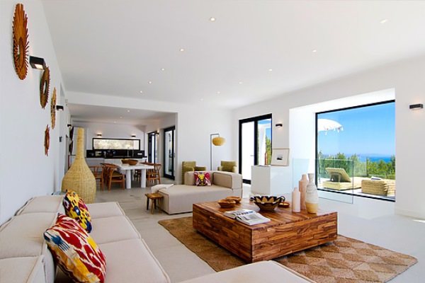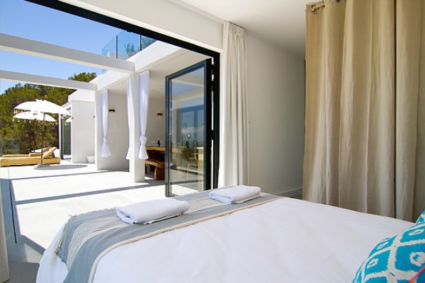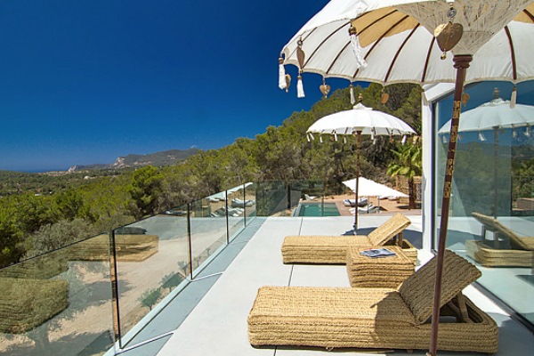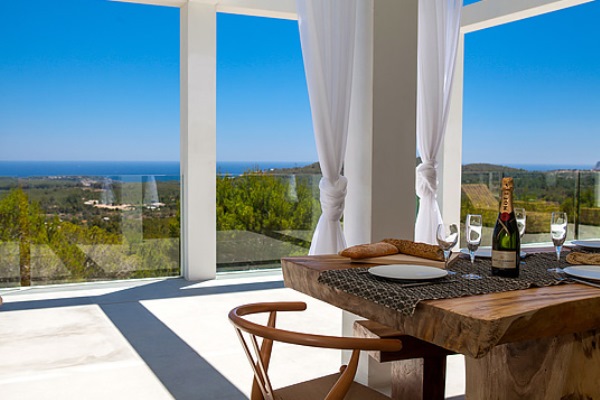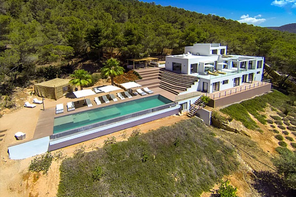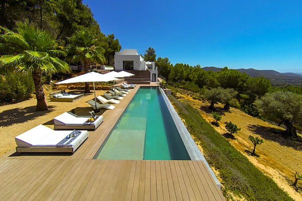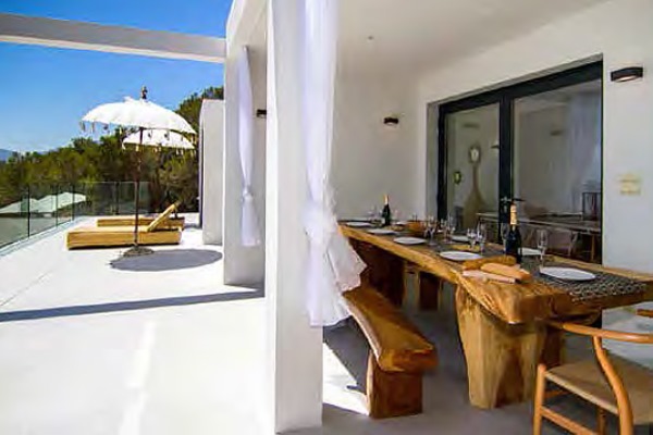 A truly modern and luxury hillside villa nestled amid the pine forested slopes overlooking Porroig Bay, Cala Jondal, Porroig and Es Cubells is one of the most seductive properties on the island of Ibiza. This deluxe Balearic residence is a very private, gated and secluded away in an already very quiet area. You will have very few neighbours and the airport (10 km), Ibiza Town (12 km) and the beaches of Cala Jondal and Es Cubells (8 minutes’ drive) are easily accessible. One of the outstanding qualities and features of this lovely villa is the artful arrangement of terraces layered to the hill’s slope. Another is the clever reclamation and distribution of light, air and space accentuated by a highly prominent design featuring clean and sharp lines with pristine white walls and flooring. Outside a magnificent, almost twenty-metre long infinity swimming pool stretches along its own terrace accompanied by a wide, wood-laden sun deck overlooking an olive grove to the sea beyond. Wide, tall, full-length windows and sliding glazed walls opening the interior to layers of terrace promote an immaculate distribution of light and air throughout; features that make this hilltop property an exciting addition in the luxury villa rental niche of Ibiza.