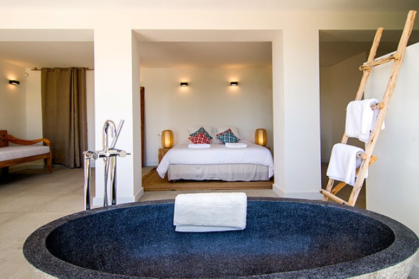 | Top floor: | Master bedroom en-suite, sitting room and outdoor shower and bath on the roof terrace with panoramic sea views |